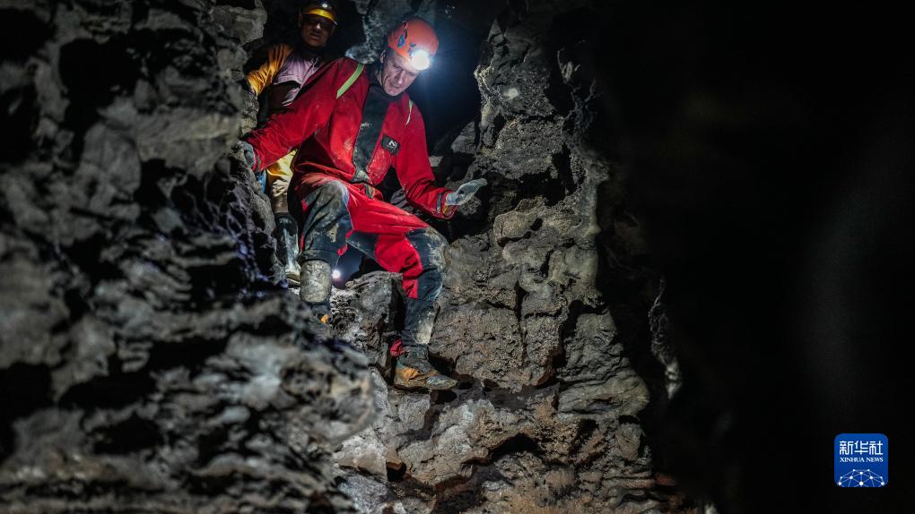 9月24日,意大利專(zhuān)家和貴州省山地資源研究所科考隊員在雙河洞一處支洞中行進(jìn)。