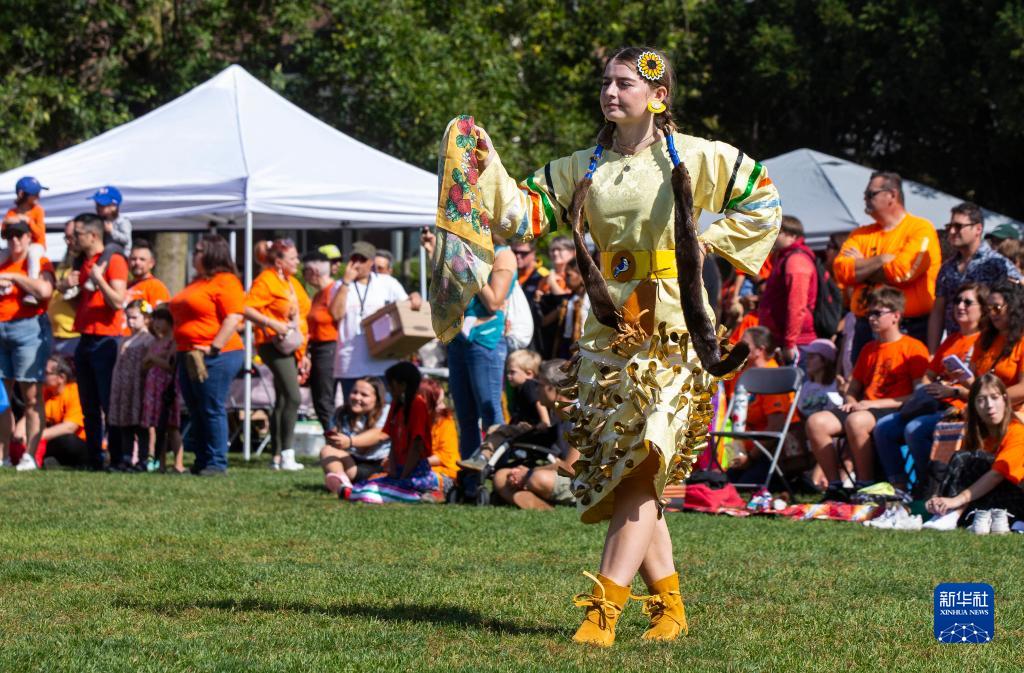 9月30日,一名身著(zhù)原住民服飾的女孩在加拿大多倫多舉辦的“全國真相與和解日”紀念活動(dòng)中表演舞蹈。