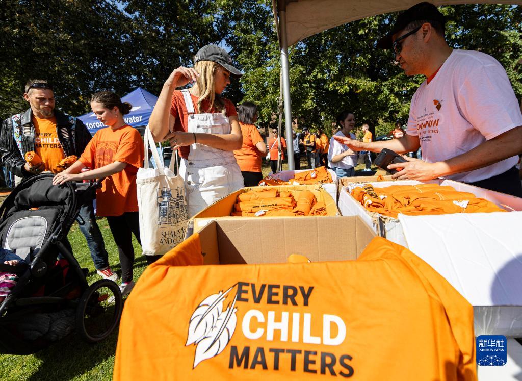 9月30日,一名女子在加拿大多倫多舉辦的“全國真相與和解日”紀念活動(dòng)中準備購買(mǎi)印有“每個(gè)孩子都很重要”字樣的橙色T恤衫。