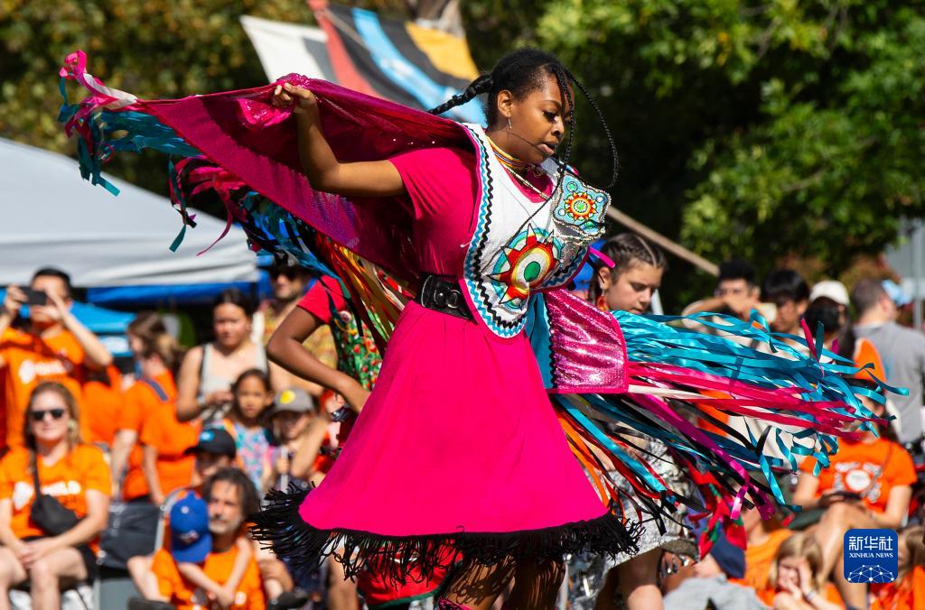 9月30日,身著(zhù)原住民服飾的兒童在加拿大多倫多舉辦的“全國真相與和解日”紀念活動(dòng)中表演舞蹈。