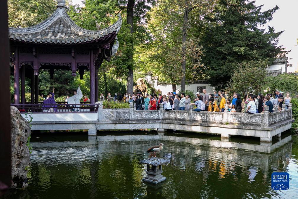 中秋、國慶“雙節”到來(lái)之際,德國法蘭克福的中式園林“春華園”于9月30日舉辦漢服游園會(huì ),漢服展示、舞蹈表演、中國傳統文化體驗等多種活動(dòng)吸引了眾多游客參加。