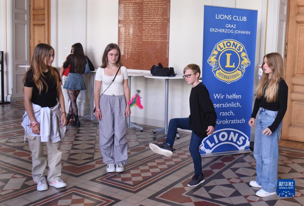 9月30日,在奧地利格拉茨大學(xué)活動(dòng)現場(chǎng),孩子們體驗踢毽子。