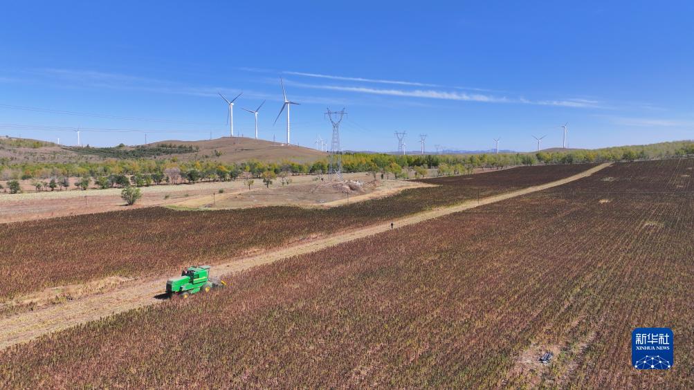 10月1日,在沽源縣白土窯鄉小西溝村,當地農機手在田間操作收割機收獲藜麥(無(wú)人機照片)。