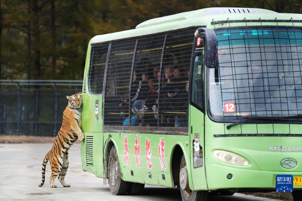 10月1日,在橫道河子東北虎林園東北虎散放區,一只東北虎“親近”觀(guān)賞車(chē)。