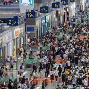 10月1日,上海虹橋火車(chē)站候車(chē)大廳里人頭攢動(dòng)。