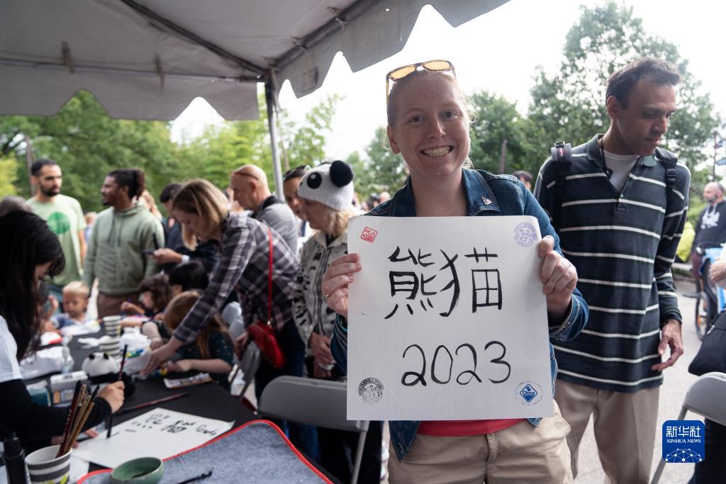 9月30日,在美國華盛頓史密森學(xué)會(huì )國家動(dòng)物園,游客體驗大熊貓主題書(shū)法活動(dòng)。