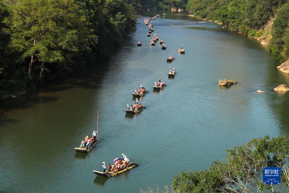 10月1日,游人乘坐竹筏欣賞武夷山國家公園九曲溪兩岸風(fēng)景。