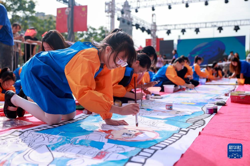 10月1日,在江蘇省泰興市萬(wàn)達廣場(chǎng),百名兒童在百米長(cháng)卷上作畫(huà)。