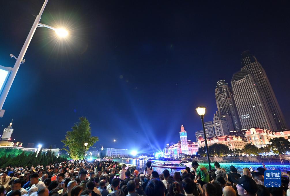10月1日,游人在天津市海河兩岸觀(guān)看燈光秀。
