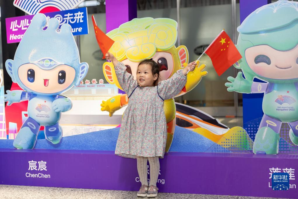 10月1日,小朋友在上海虹橋火車(chē)站候車(chē)區揮舞國旗。