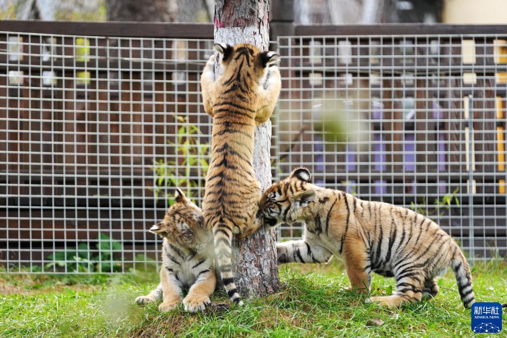 10月1日,橫道河子東北虎林園的幼虎在草地上玩鬧。