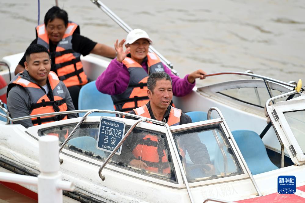 在山西磧口古鎮,村民張保生(前)駕駛快艇在黃河上行駛(9月26日攝)。張保生以前以擺渡為生,開(kāi)的是木船和鐵船,2000年考了快艇駕駛證。如今,他農忙時(shí)種地,農閑時(shí)開(kāi)快艇帶著(zhù)游客在黃河上觀(guān)光,一年能收入3萬(wàn)多元。