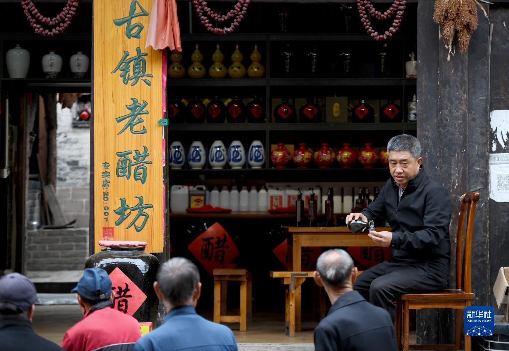 在山西磧口古鎮,張海龍邀請游客品嘗陳醋(9月26日攝)。張海龍之前是卡車(chē)司機,2018年,他在磧口古鎮開(kāi)了一家山西陳醋店,吸引不少游客光顧。