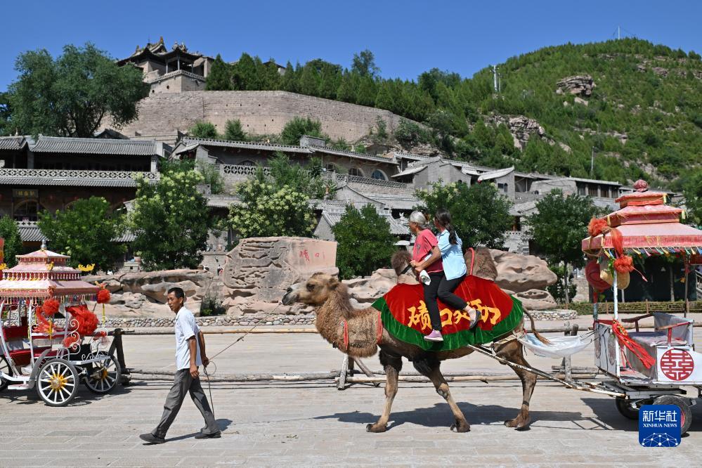 在山西磧口古鎮,村民劉金兔(左)拉著(zhù)駱駝在古鎮行走(8月2日攝)。劉金兔之前在建筑工地打工。2016年,他看見(jiàn)來(lái)古鎮旅游的客人越來(lái)越多,和家人商量后,買(mǎi)了駱駝在景區供游客騎乘。