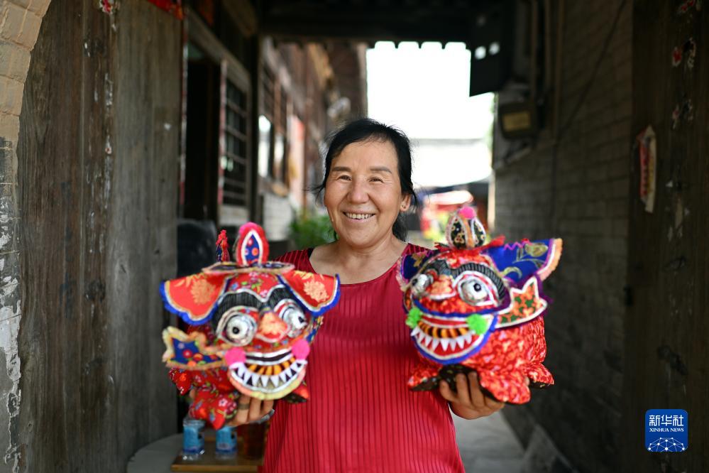 在山西磧口古鎮,村民馮延愛(ài)展示自己制作的布老虎(8月2日攝)。近年來(lái),到磧口古鎮觀(guān)光的游客越來(lái)越多,馮延愛(ài)制作的布老虎和布鞋得到游客的青睞??夸N(xiāo)售布老虎和布鞋,馮延愛(ài)一年收入3萬(wàn)多元。