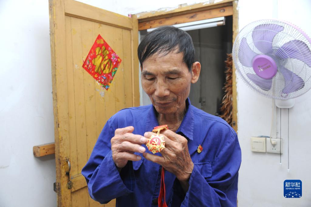 10月2日,梁樂(lè )在家中查看“在黨50年徽章”。