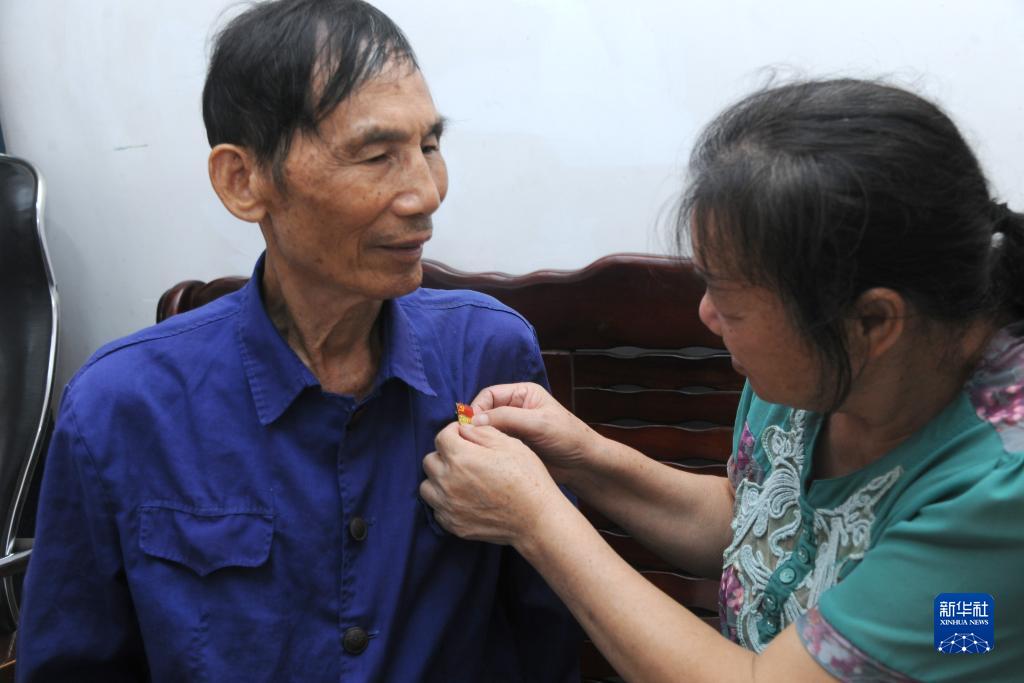 10月2日,梁樂(lè )的愛(ài)人幫他戴上黨徽。