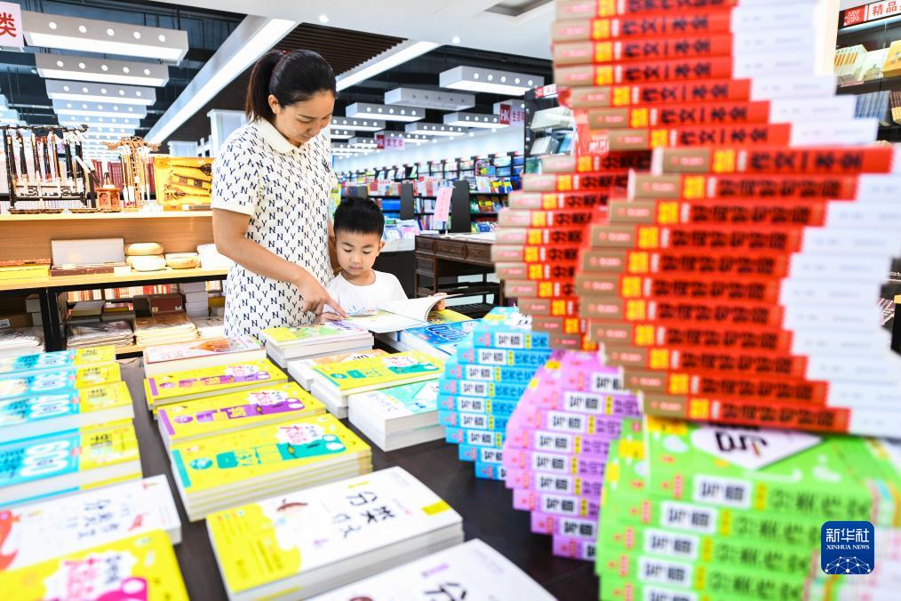 10月2日,家長(cháng)在湖南省常寧市新華書(shū)店給孩子講解書(shū)籍內容。