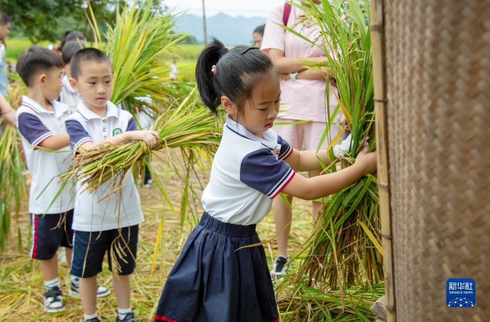 10月2日,在福建省武夷山市下梅村,小朋友在體驗手工打谷。