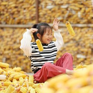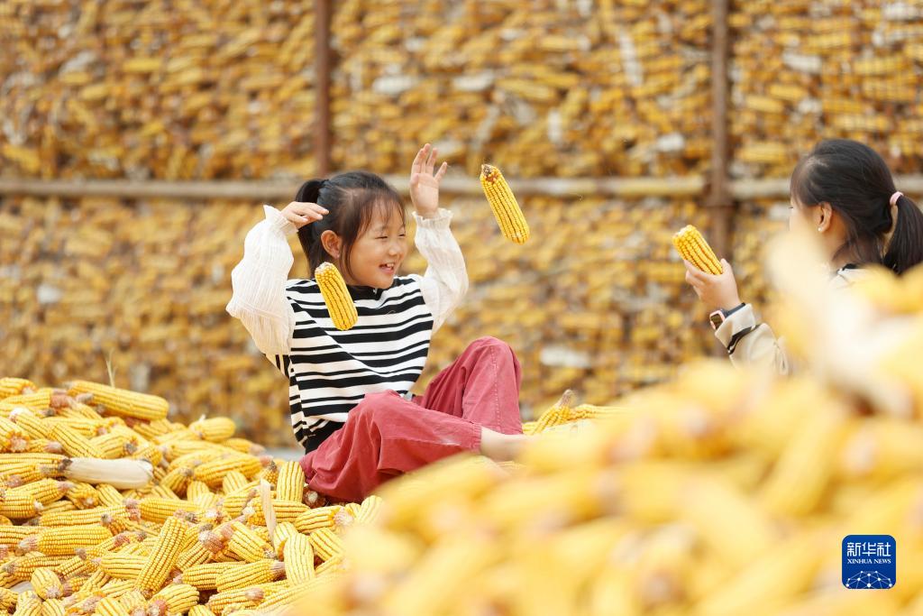 10月3日,在山東省臨沂市郯城縣郯城街道宋屯村,兩名小女孩在玉米堆上玩耍。
