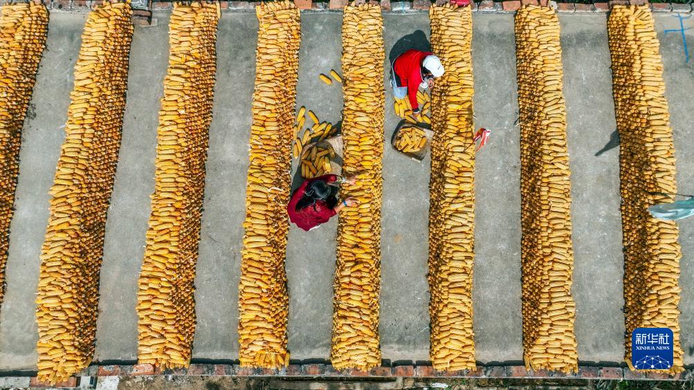 10月4日,河北省遵化市劉備寨鄉農民在碼放晾曬收獲的玉米(無(wú)人機照片)。