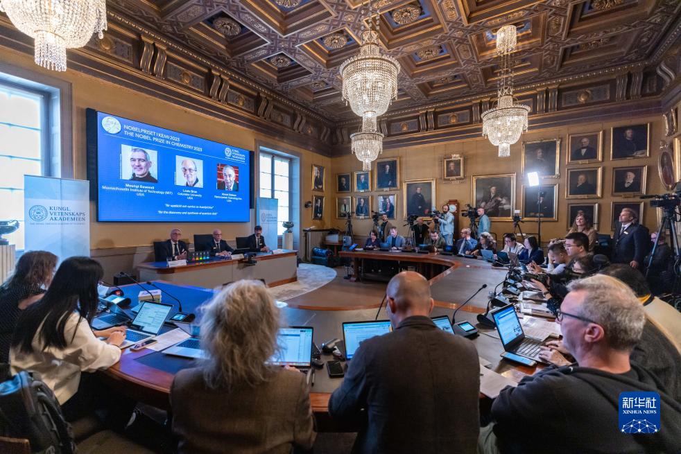 這是10月4日在瑞典斯德哥爾摩拍攝的2023年諾貝爾化學(xué)獎公布現場(chǎng)。