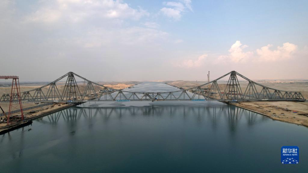 這是2021年11月17日在埃及伊斯梅利亞省拍攝的蘇伊士運河鐵路橋舊橋改造升級項目施工現場(chǎng)(無(wú)人機照片)。蘇伊士運河鐵路橋連接非、亞大陸。