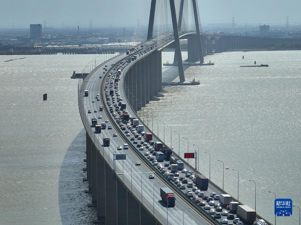 10月5日拍攝的蘇通大橋返程車(chē)流(無(wú)人機照片)。