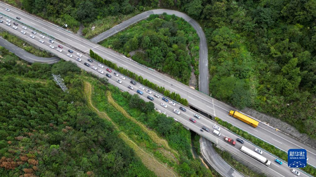 10月5日拍攝的廈蓉高速貴州省黎平縣雙江鎮境內返程車(chē)流(無(wú)人機照片)。