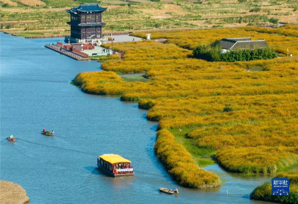 10月5日,游客在江蘇省興化市千垛菊花景區乘坐電動(dòng)游船游玩(無(wú)人機照片)。