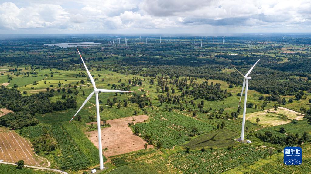 這是10月5日在泰國猜也蓬府拍攝的由中國金風(fēng)科技提供的風(fēng)力發(fā)電機(無(wú)人機照片)。