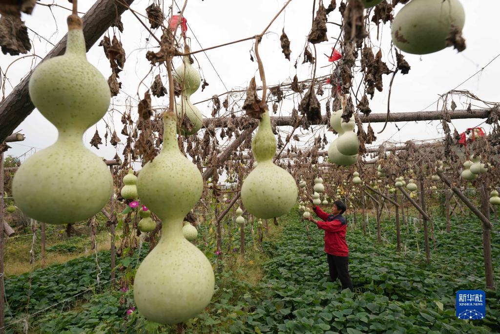 10月5日,河北省邢臺市信都區會(huì )寧鎮張爾莊村村民在葫蘆園內采摘葫蘆。