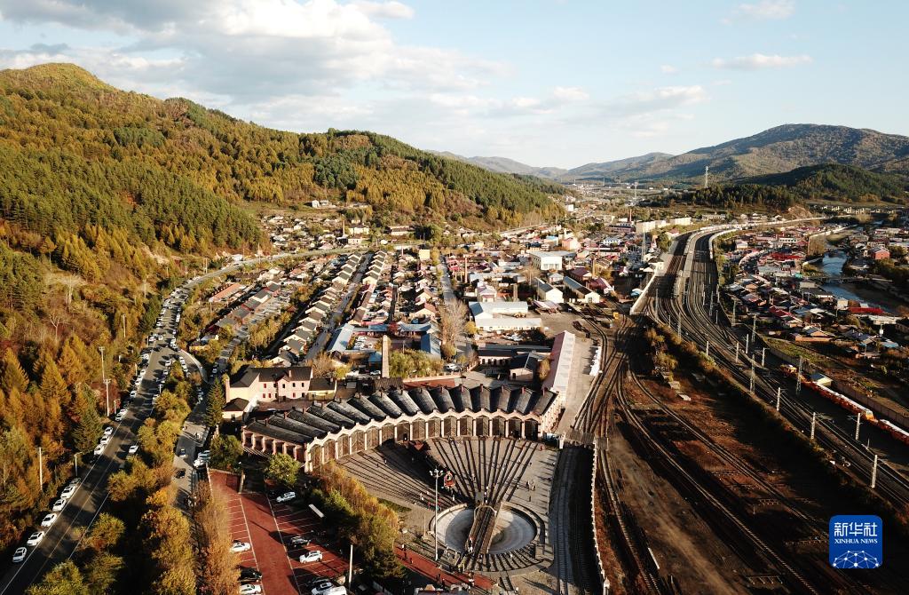 這是10月2日拍攝的橫道河子中東鐵路機車(chē)庫遺址和部分俄式建筑(無(wú)人機照片)。