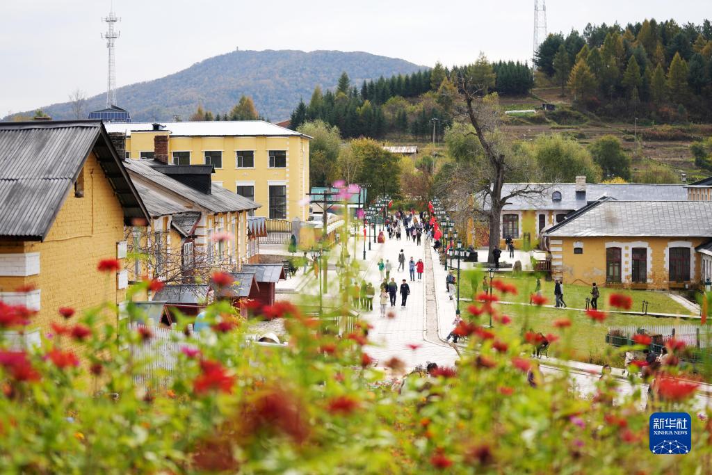 10月3日,游客在橫道河子鎮的文化藝術(shù)主題街區游覽拍照。