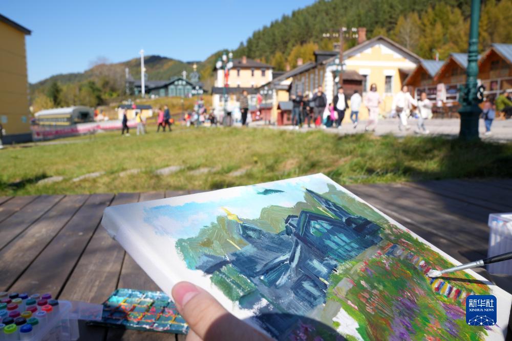 10月2日,學(xué)生在橫道河子鎮的文化藝術(shù)主題街區寫(xiě)生。