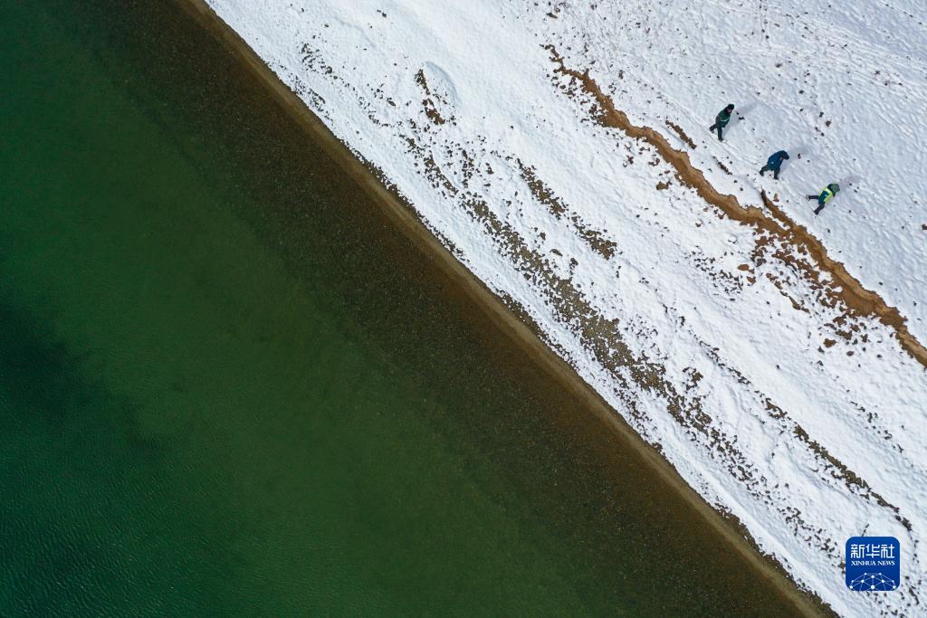 2021年10月20日,在青海省果洛藏族自治州瑪多縣扎陵湖鄉勒那村,三江源國家公園黃河源園區生態(tài)管護員在巡護(無(wú)人機照片)。