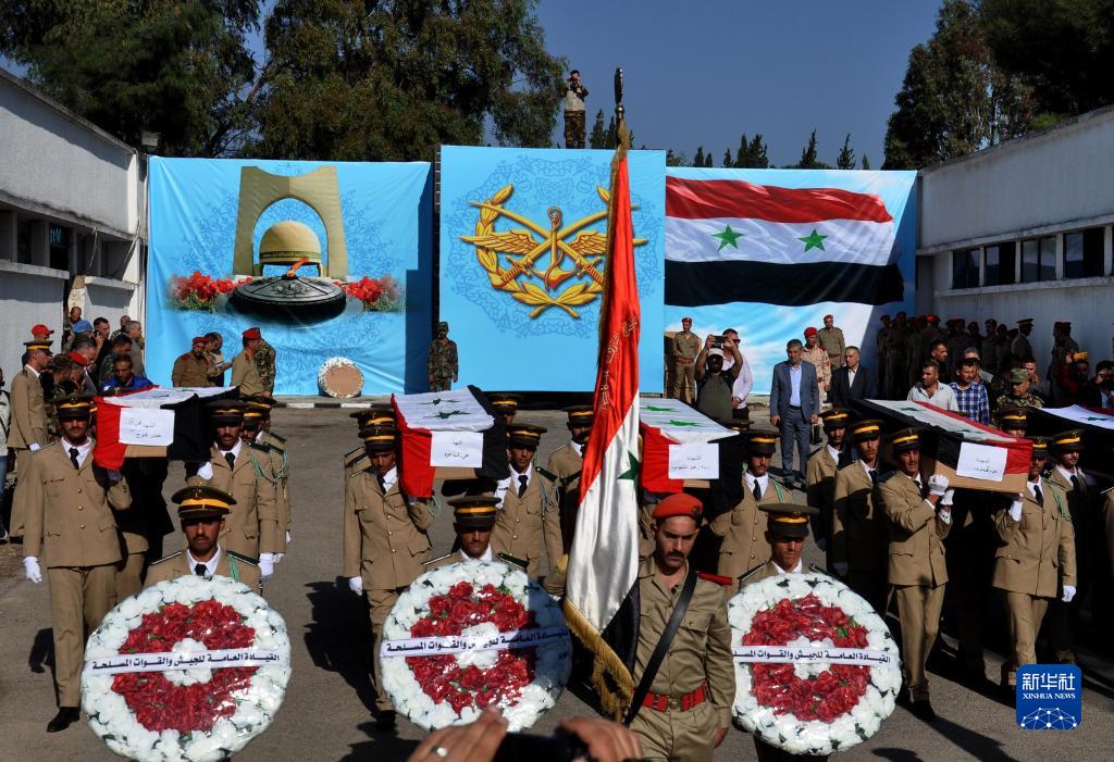 10月6日,敘利亞士兵在霍姆斯參加無(wú)人機襲擊遇難者葬禮。