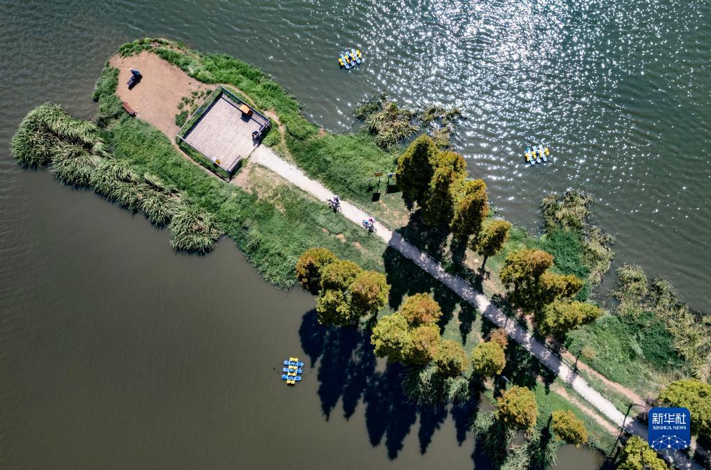 10月6日,市民在由滇池綠道串聯(lián)的干尾溝濕地公園游覽(無(wú)人機照片)。