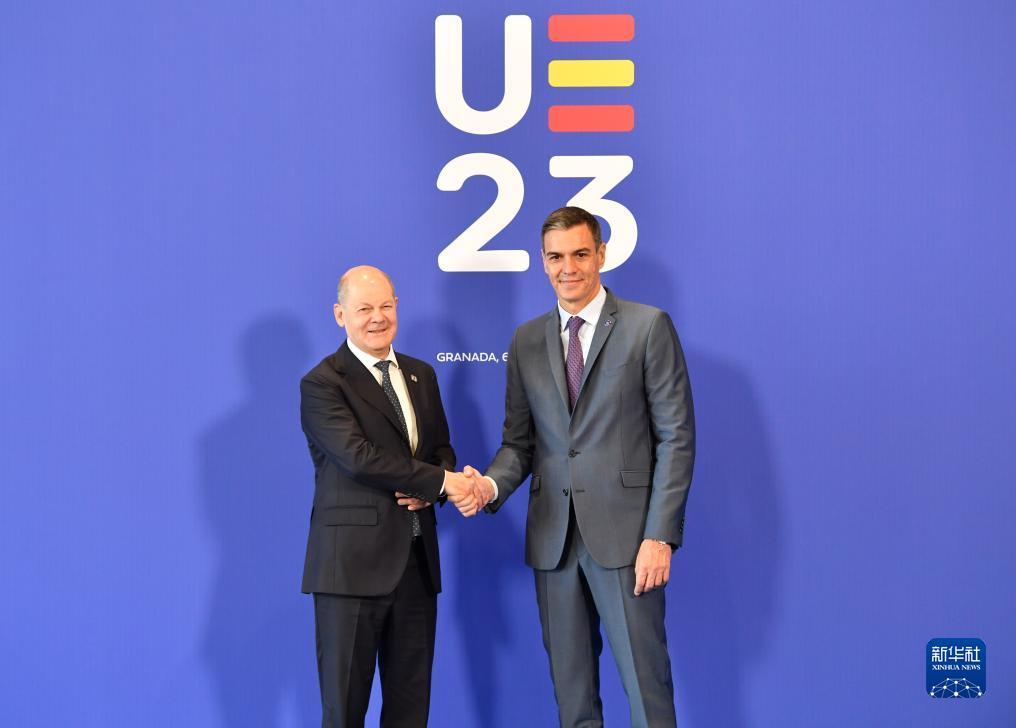 10月6日,在西班牙南部城市格拉納達,前來(lái)參加歐盟領(lǐng)導人非正式會(huì )議的德國總理朔爾茨(左)與西班牙代理首相桑切斯致意。