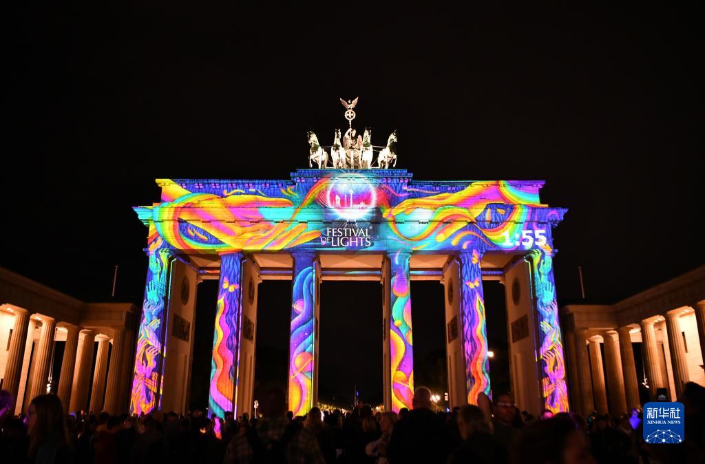 10月6日,德國柏林勃蘭登堡門(mén)被燈光點(diǎn)亮。