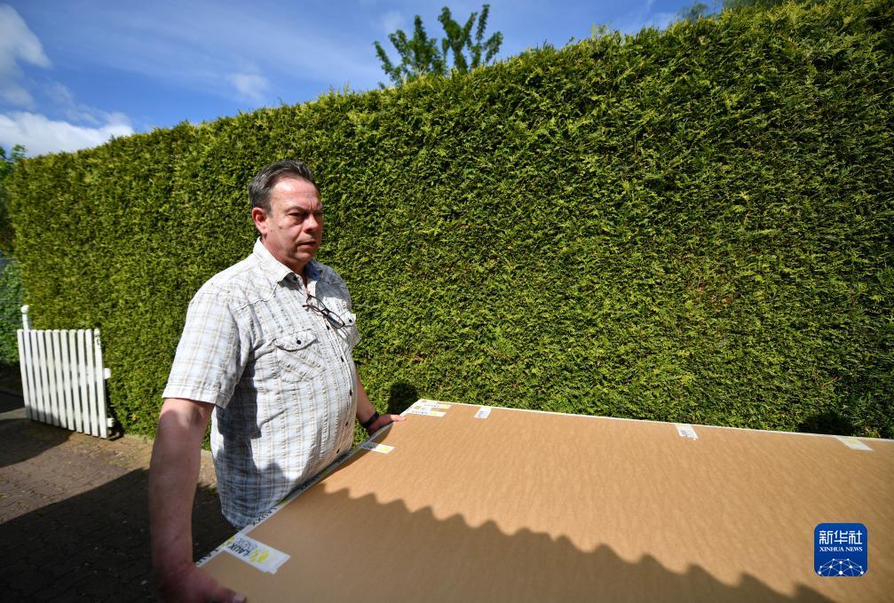 在德國施瓦岑貝克小鎮,當地居民迪爾克搬運從經(jīng)銷(xiāo)商處訂購的中國產(chǎn)太陽(yáng)能設備(5月30日攝)。