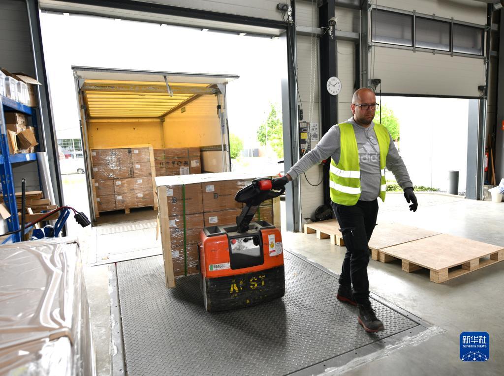 在位于德國阿倫斯堡的產(chǎn)品經(jīng)銷(xiāo)商勞克斯新能源有限公司,工作人員卸載中國產(chǎn)微型逆變器產(chǎn)品(5月30日攝)。