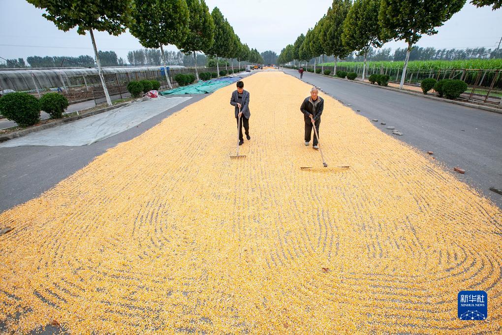 10月7日,在河南省焦作市博愛(ài)縣清化鎮街道太子莊村,村民晾曬剛收獲的玉米。