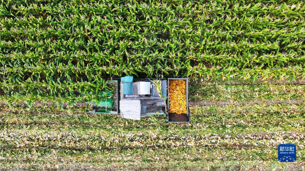 10月6日,山東省鄒平市黃山街道農民在收獲玉米(無(wú)人機照片)。