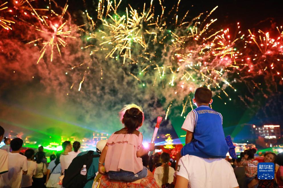 10月1日,游客在貴州省黔東南苗族侗族自治州凱里市下司古鎮觀(guān)賞煙花。