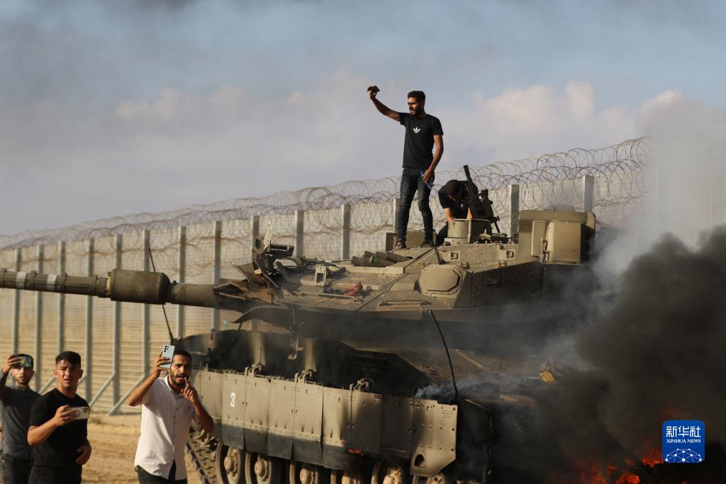 10月7日,在加沙地帶城市汗尤尼斯以東的邊境地區,巴勒斯坦人出現在一輛以色列坦克附近。