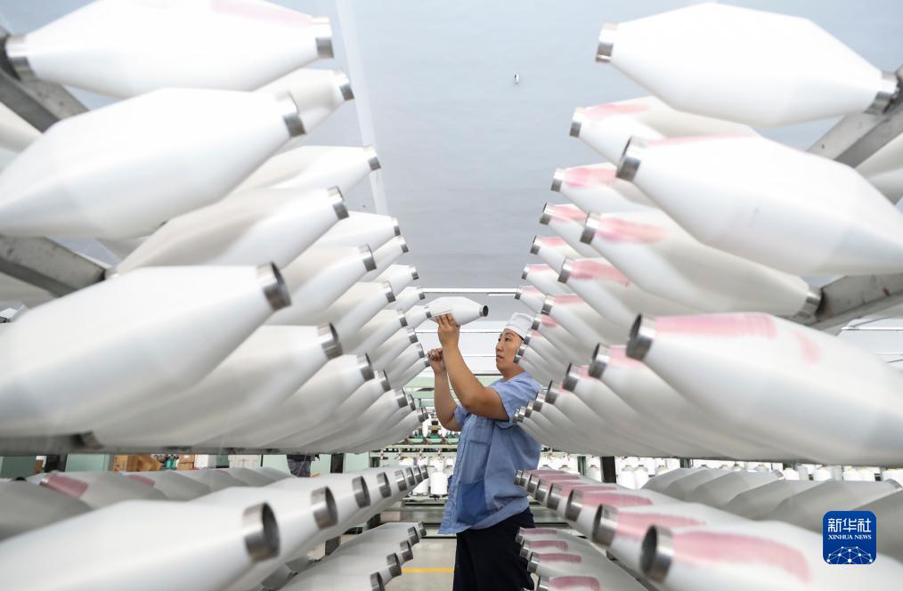 10月7日,紡織工人在江蘇省淮安市一車(chē)間內紡紗作業(yè)。
