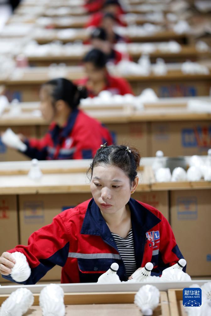 10月7日,工人在貴州省錦屏經(jīng)濟開(kāi)發(fā)區貴州亞獅龍體育文化產(chǎn)業(yè)發(fā)展有限公司羽毛球生產(chǎn)基地工作。