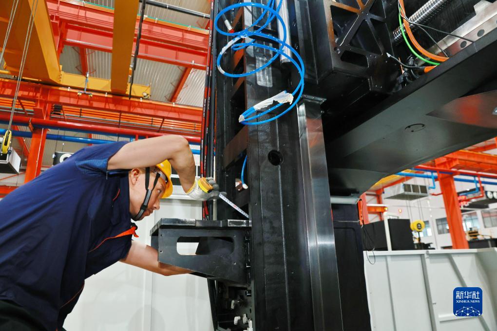 10月7日,南通國盛智能科技集團股份有限公司工人在生產(chǎn)車(chē)間安裝主軸電機基座。