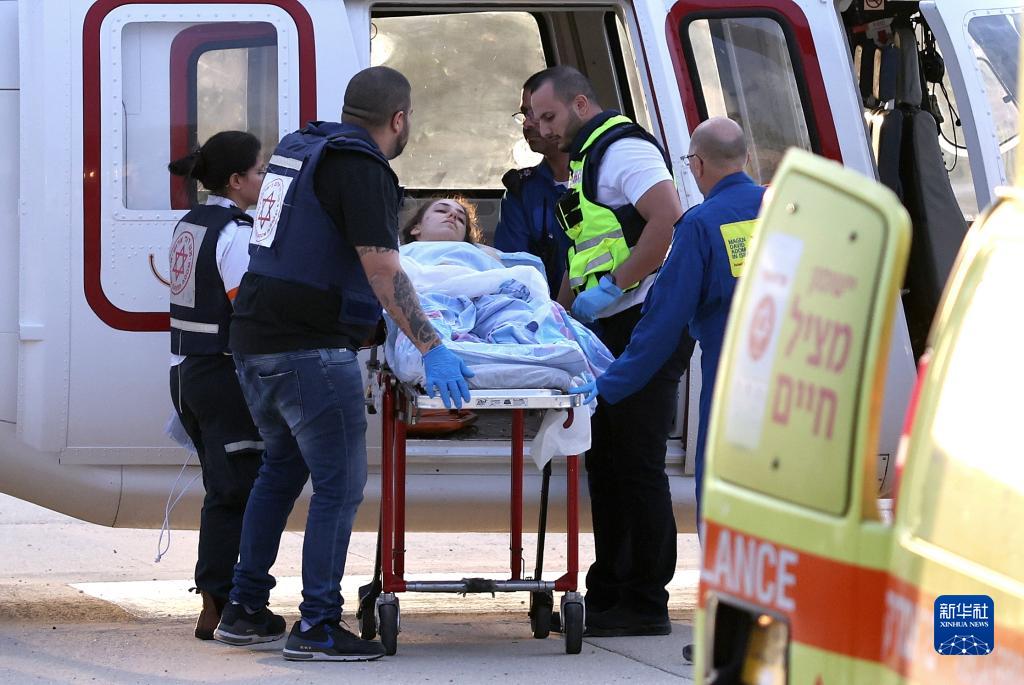 10月7日,在以色列南部城市阿什凱隆,傷者被直升機轉運接受治療。